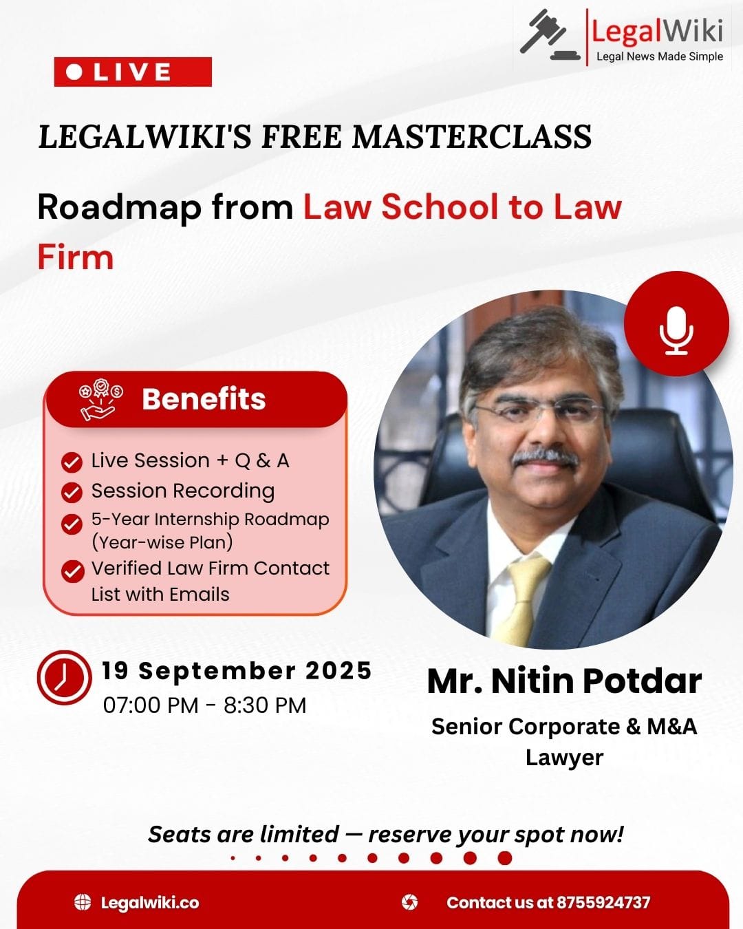 In this exclusive live masterclass, Mr. Nitin Potdar, Senior Corporate and M&A lawyer, will share insider insights, real-world experiences, and practical steps to help you plan your journey from law school to a successful law firm career.